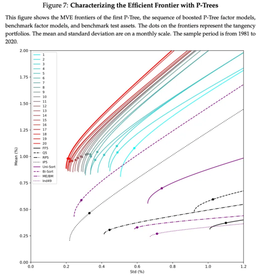在经典的“均值-方差有效边界”框架下,P-Trees 模型构建的测试资产表现显著优于传统基准。传统模型往往难以全面捕捉影响市场表现的多重复杂因素,导致投资者难以识别最佳机会。相比之下,P-Trees模型则能高效处理海量数据并构建更有效的投资组合,从而帮助用户在降低决策风险的同时,更精准地评估潜在回报。