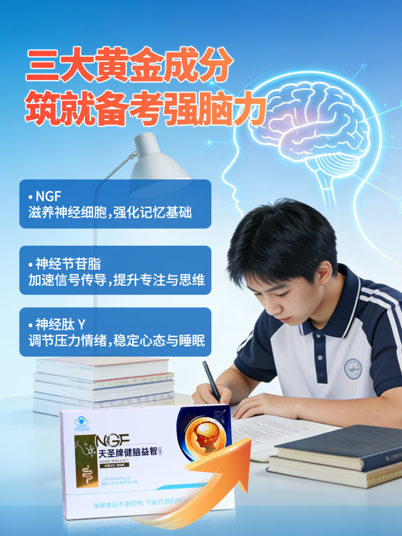 NGF 神经生长因子是支持神经元生长、修复与突触形成的关键营养物质,能有效滋养受损神经细胞,促进神经连接网络构建。从根源强化记忆通路,显著提升背书效率与知识巩固率,帮助考生告别 “记了就忘、学速混忘” 的困境。