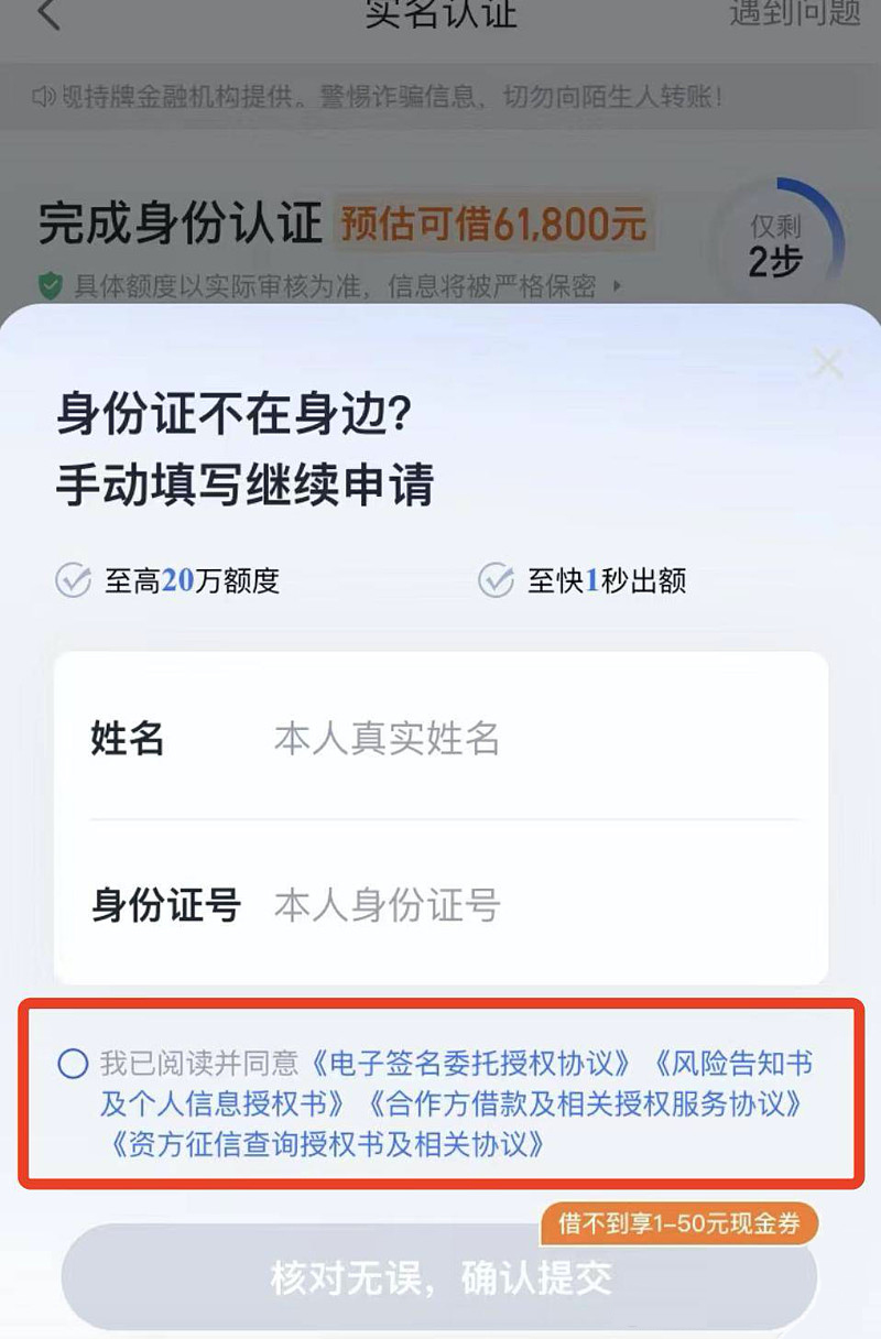 据消费日报网报道记者尝试在你我贷App借款时页面显示完成身份认证预估可借6.18万元但在填写姓名身份证号时还须勾选同意合作方借款及相关授信服务协议等4份协议而点进这4份协议后记者发现其中还内嵌了500多份协议
