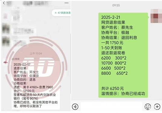 为了吸引潜在客户广告中还挂出了近期多位客户协商退息退费成功的案例显示协商成功后消费者收到了退还的现金或是还款返现券