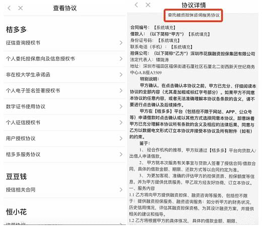 其中和嘉银科技旗下的海南银科融资担保有限公司相关的担保协议内嵌在风险告知书及个人信息授权书里的5份合同之中此外你我贷App还与其他网贷平台合作为用户提供借款推荐服务桔多多等这数十家合作方的服务协议包含在合作方借款及相关授信服务协议中合计约545份如委托担保咨询服务协议等相关的服务协议便深藏在这500多份协议中