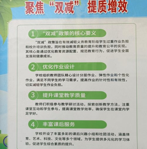 自2021年中共中央办公厅、国务院办公厅印发《关于进一步减轻义务教育阶段学生作业负担和校外培训负担的意见》以来,我校积极响应并坚决贯彻党的教育方针,坚持为党育人、为国育才,落实立德树人的教育理念,把“双减”作